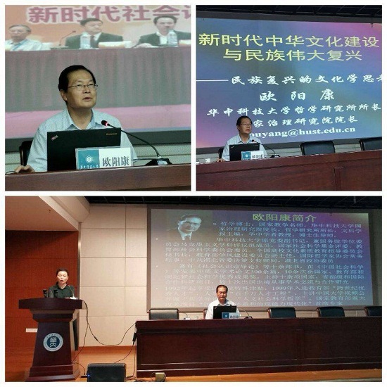 欧阳教授以中国梦与中华文化建设为切入点,阐述了对民族伟大复兴的价值理解,强调开启民族复兴之路要牢记“三个对话”——与历史对话、与时代对话、与心灵对话,要立足当代看中华民族伟大复兴的价值,要结合新时代解读文化建设的内涵。然后他以哲学的方式提出“价值与文化在当代中国何以为问题”,从中国文化问题的历史生成、当代中国的文化困惑、文化的多维解读、文化的人文理解、文化自觉与文化选择等五个方面进行追本溯源的剖析,再从文化建设的角度介绍了当代世界的价值碰撞和中国价值。