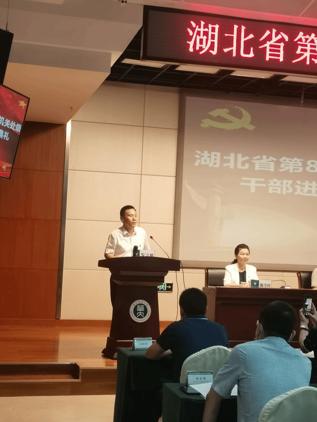 典礼最后,来自湖北省人民政府办公厅学员吴磊作为学员代表发言。他表示,在新形势下要积极响应党中央“加强思想政治建设,提高自身政治素养”的号召,珍惜此次锤炼党性的机会。最后他代表全体学员郑重表态:在之后的学习中,全体学员将以最严的要求和最实的作风,严守规矩,认真学习,精诚团结,共同进步。