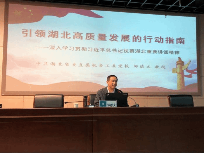 2019年10月8日上午,湖北省委直属机关工委党校校长邹德文教授在华中师范大学为79期省直机关处级干部进修班带来了国庆假期后的第一场专题讲座,本次课程的题目是《引领湖北高质量发展的行动指南——深入学习贯彻习近平总书记视察湖北重要讲话精神》。