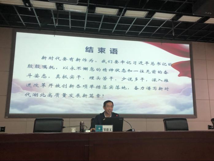 邹德文同志是二级教授,全国优秀社会科学普及名家,主要研究政治经济学、发展经济学、创新经济学,在实践中致力于高新技术与科技园区,长江经济带、中国经济发展问题的研究,对于国情和省情的发展了解深入,有理论,有观点,有实践。在这次授课中,邹教授本着“理思路,提观点”的教学理念,从理论指导、湖北嘱托、实践基础、推进措施四个方面为学员们解读:习近平总书记在2019年5月推进中部地区崛起工作座谈会上提出的八点意见;2018年4月考察长江、视察湖北发表重要讲话时对湖北提出的“四个切实”明确要求;2013年7月视察湖北主持召开座谈会发表重要讲话首次提出的全面深化改革的“四个着力”。邹教授授课案例丰富,使学员们了解了其丰富内涵和精神实质,明确了湖北在高质量发展中肩负的责任和使命,清醒的认识到改变“三个不优、三个不充分”面临的压力和挑战,同时让学员们坚定了实现高质量发展的信心和决心。