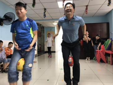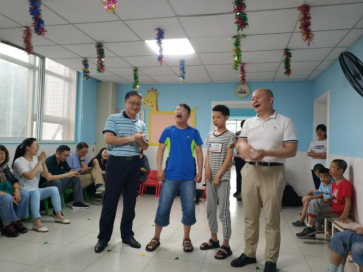康复中心三楼,唐氏儿和自闭症儿童正在上游戏课,当看到7801班的同学们到来时,孩子们大声喊道“阿姨好!伯伯好!”