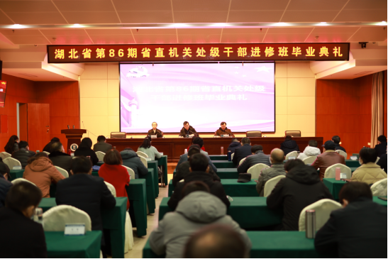 2022年1月14日上午,湖北省第86期省直机关处级干部进修班毕业典礼在华中师范大学管理教育综合大楼一楼多功能厅顺利举行。华中师范大学党委常委、党委副书记陈迪明,华中师范大学校长助理、培训中心党委书记林更茂,华中师范大学原文学院党委书记、本班班主任谭根稳等出席了此次典礼。典礼由谭根稳主持。