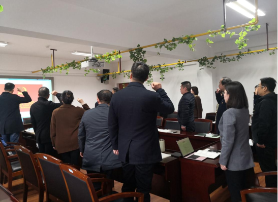 在庄严的国歌声中,主题党日活动拉开序幕,全体学员怀着崇高敬意和无比自豪的心情齐唱国歌,面向党旗高举右手庄严宣誓,铿锵恢宏的誓词强烈震撼着在场每位党员。一字一句,神圣而豪迈,铮铮誓言,体现了对中国共产党的无限忠诚。