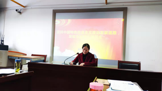 襄阳铁路运输法院戴蓉同志从坚持党的领导,保证有效治理;坚持从国情出发,借鉴他国有益成果,深化政治体制改革;坚持人民代表大会制度,扩大人民有序参与;坚持依法治国,加强和改进立法工作;创新民主形式,拓宽实践渠道和方式,提升民主内涵等五个方面,阐述了“坚持中国特色社会主义政治发展道路,发展全过程人民民主”的构想。